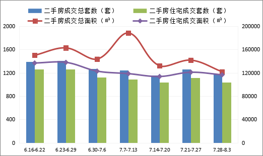 2025.7.28-8.3周苏州市二手房共计成交1173套,较上周减少85套,环比下降6.76%;成交总面积121864.04㎡,较上周减少19837.25㎡,环比下降14.00%。本周住宅成交量1039套,较上周减少74套,环比下降6.65%;成交面积116546.13㎡,较上周减少4438.83㎡,环比下降3.67%。其中,住宅总成交面积占成交总面积的95.64%。