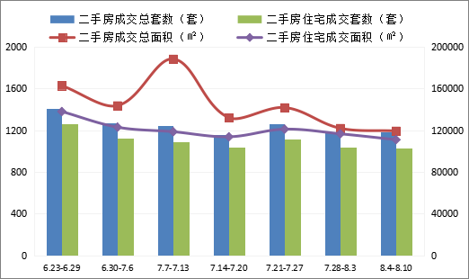 2025.8.4-8.10周苏州市二手房共计成交1187套,较上周增加14套,环比上涨1.19%;成交总面积119305.81㎡,较上周减少2558.23㎡,环比下降2.10%。本周住宅成交量1028套,较上周减少11套,环比下降1.06%;成交面积110921.78㎡,较上周减少5624.35㎡,环比下降4.83%。其中,住宅总成交面积占成交总面积的92.97%。