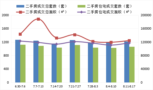 2025.8.11-8.17周苏州市二手房共计成交1218套,较上周增加31套,环比上涨2.61%;成交总面积124252.1㎡,较上周增加4946.29㎡,环比上涨4.15%。本周住宅成交量1062套,较上周增加34套,环比上涨3.31%;成交面积117138.72㎡,较上周增加6216.94㎡,环比上涨5.60%。其中,住宅总成交面积占成交总面积的94.28%。