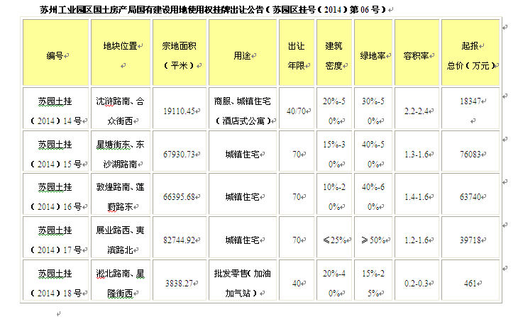 ◎ 继苏州国土局推出22宗地块之后,10月29日苏州工业园区国土房产局再次挂牌5宗地块。其中14号地块位于雅戈尔未来城萧邦南面,用于商服或城镇型住宅,另15、16、17号地块为纯住宅地块,分别位于白塘公园东、墩头村以及青剑湖阿卡迪亚附近,18号地块为加油站。