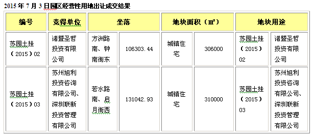 ◎2015年7月3日,被期待了整整一个月的园区土地出让盛宴终于拉开了帷幕,九龙仓、万科、旭辉、招商、龙湖、中海、金地、融创、中锐、南山、新城、朗诗、海亮、首开、红星、中南、港中旅、阳光城、龙湖&中新、路劲、仁恒、天津房产、中航里程等23家房企悉数到场,参与土拍。此次土拍仅出让2宗地块,合计成交面积237346.37㎡,成交金额达61.6亿元,苏园土挂(2015)02号地块出让历时22分钟,海亮地产以30.6亿将之收入囊中,楼面价达15992元每平方米,溢价率达113.23%;苏园土挂(2015)03号地块竞拍历时42分钟,最终,旭辉地产以31亿元的高价拍得,楼面价拍出14785元每平方米,溢价率达84.82%再创新高。