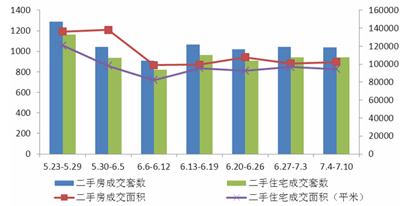 2016.7.4-7.10:本周二手房成交量1038套(不含吴江区),较前一周下降5套,降0.48%;成交面积102279.6平方米,较前一周环比上涨1.42%。由上述数据可见,本周二手房住宅成交量较上周微幅上涨,非住宅成交量小幅下降,成交量基本与上周持平。
