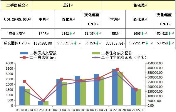 2019.04.29-2019.05.05周苏州市二手房成交总量1698套,较上周减少1792套,环比下跌51.35%;成交总面积169498.88平方米,较上周减少217682.52平方米,环比下跌56.22%。本周,住宅成交量1553套,较上周减少1605套,环比下跌50.82%;成交面积153768.84平方米,较上周减少177972.47平方米,环比下跌53.65%。其中,住宅总成交面积153768.84㎡,占成交总面积的90.72%。