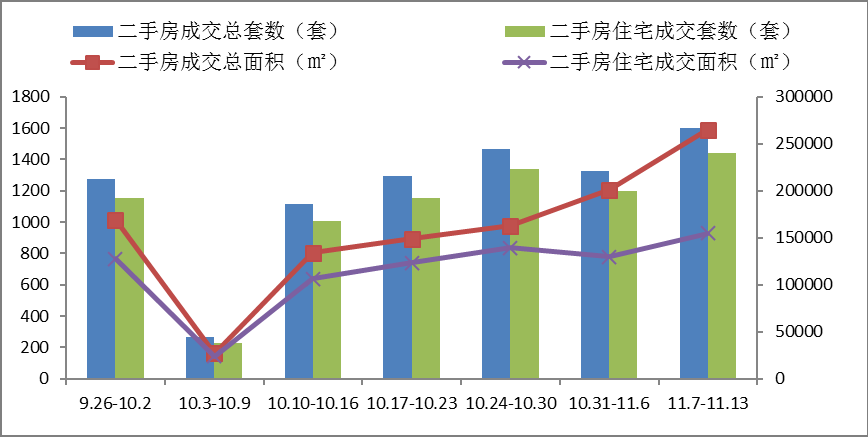 2022.11.7-11.13周苏州市二手房共计成交1599套,较上周增加273套,环比上涨20.59%;成交总面积265067.07㎡,较上周增加64235.09㎡,环比上涨31.98%。本周住宅成交量1438套,较上周增加239套,环比上涨19.93%;成交面积154770.91㎡,较上周增加25102.79㎡,环比上涨19.36%。其中,住宅总成交面积154770.91㎡,占成交总面积的58.39%。