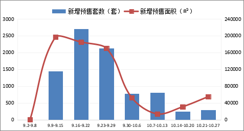 本周(2024.10.21-10.27)苏州市(不含县级市)共5个项目领取预售许可证。新增预售292套,新增预售面积54488.07㎡,其中,住宅类新增291套,新增预售面积51357.17㎡。