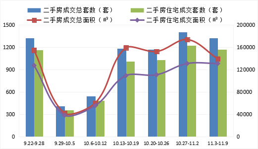 2025.11.3-11.9周苏州市二手房共计成交1322套,较上周减少82套,环比下降5.84%;成交总面积138988.47㎡,较上周减少34456.91㎡,环比下降19.87%。本周住宅成交量1168套,较上周减少56套,环比下降4.58%;成交面积130573.06㎡,较上周增加88.24㎡,环比上涨0.07%。其中,住宅总成交面积占成交总面积的93.95%