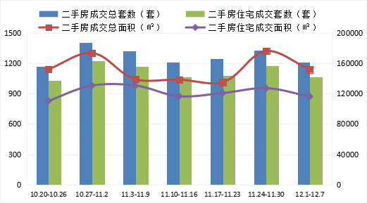 2025.12.1-12.7周苏州市二手房共计成交1212套,较上周减少114套,环比下降8.60%;成交总面积151814.72㎡,较上周减少24084.06㎡,环比下降13.69%。本周住宅成交量1067套,较上周减少106套,环比下降9.04%;成交面积116201.36㎡,较上周减少10867.38㎡,环比下降8.55%。其中,住宅总成交面积占成交总面积的76.54%。
